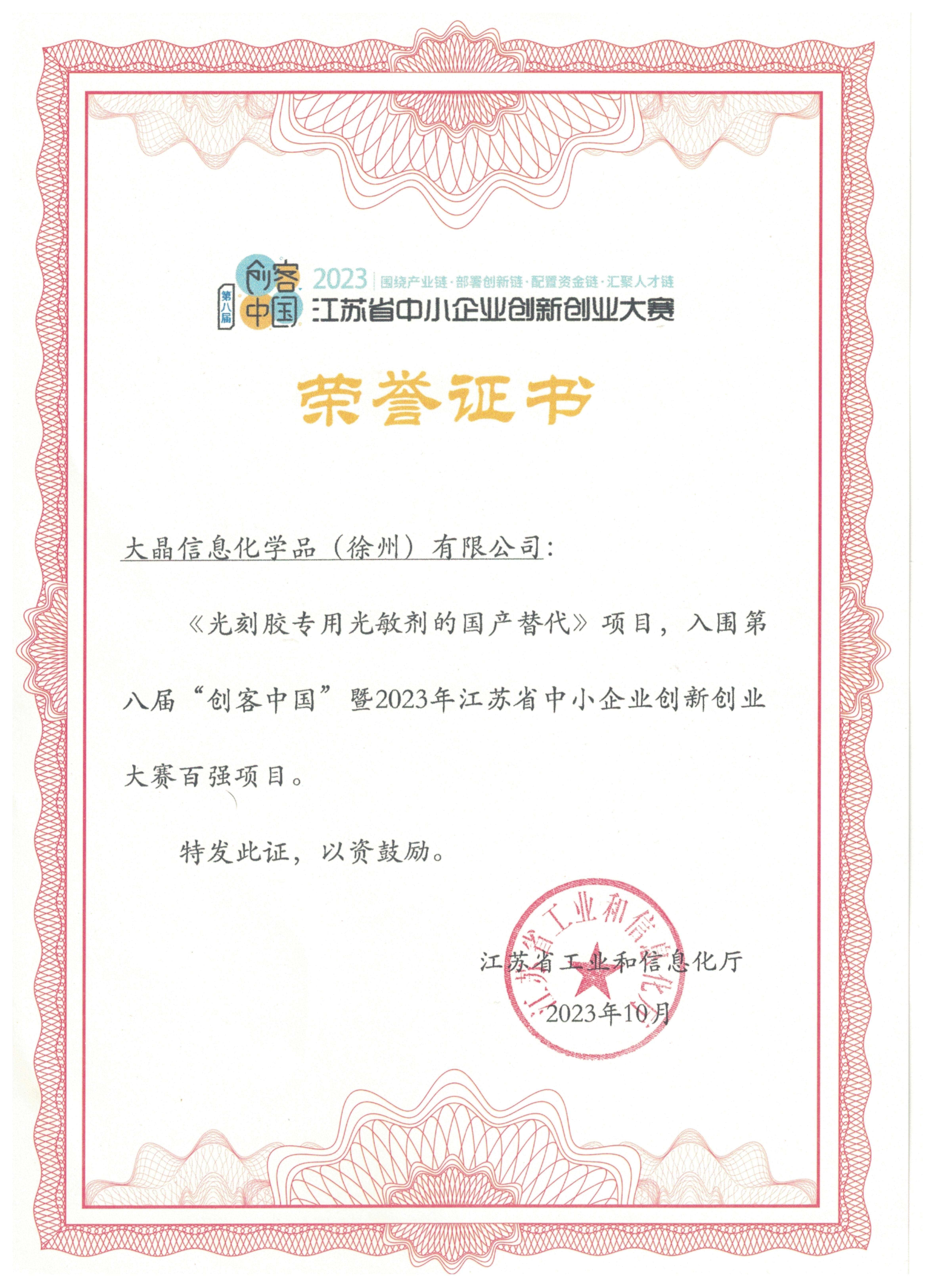 近日,第八届“创客中国”暨2023年江苏中小企业创新创业大赛总决赛在苏州圆满落幕。大晶信息化学品(徐州)有限公司携项目“光刻胶专用光敏剂的国产替代”从近800个报名项目中脱颖而出,最终入选大赛百强名单。